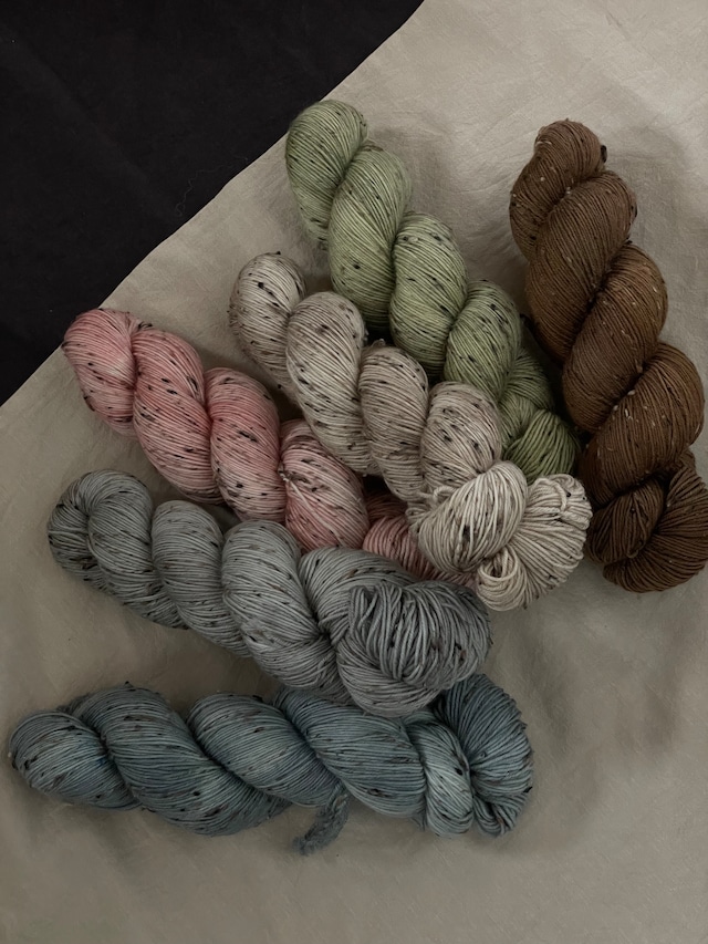 ◆ 商品情報 (Fingering) SWM 75% nylon 19% nepp 6% 410m / 100g ※アウトレットのものは、ラベルレスの場合がございます ◆ 手染め糸について ・1かせずつ丁寧に染めた手染め糸です。 ・同じカラー名でも、1つずつ濃淡や個体差があります。 ・色むらをならすため、作品づくりの際は交互編みをおすすめします。 ・必要量はできるだけまとめてご購入ください。 ・ご覧の端末により、実物と色味が異なる場合があります。